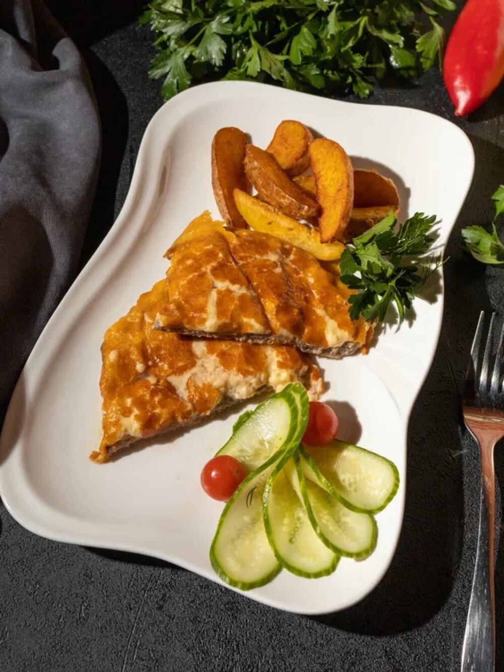Свиная шея, сыр гауда, подаётся с картофелем айдахо