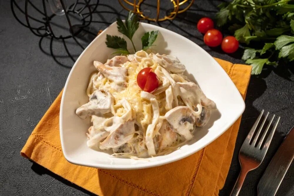 Блюдо, в котором паста сочетается с куриным филе в сливочном соусе